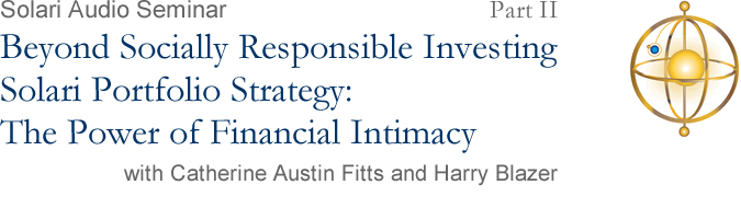 Your hosts for this seminar are Catherine Austin Fitts, president of Solari, Inc. and successful Wall Street and Washington DC investment banker, and Harry Blazer, successful entrepreneur, musician, organic foods retail expert, and local investor. For an overview see the course Description and Outline below. For a quick rundown on how our audio seminars are conducted, see How Solari Audio Seminars Work. You are encouraged to read the article(s) listed under Recommended Reading before posting your questions or tuning in. To listen to the seminar, click on the Listen or Download link under Audio Recording below. Each event ends with a brief invocation.